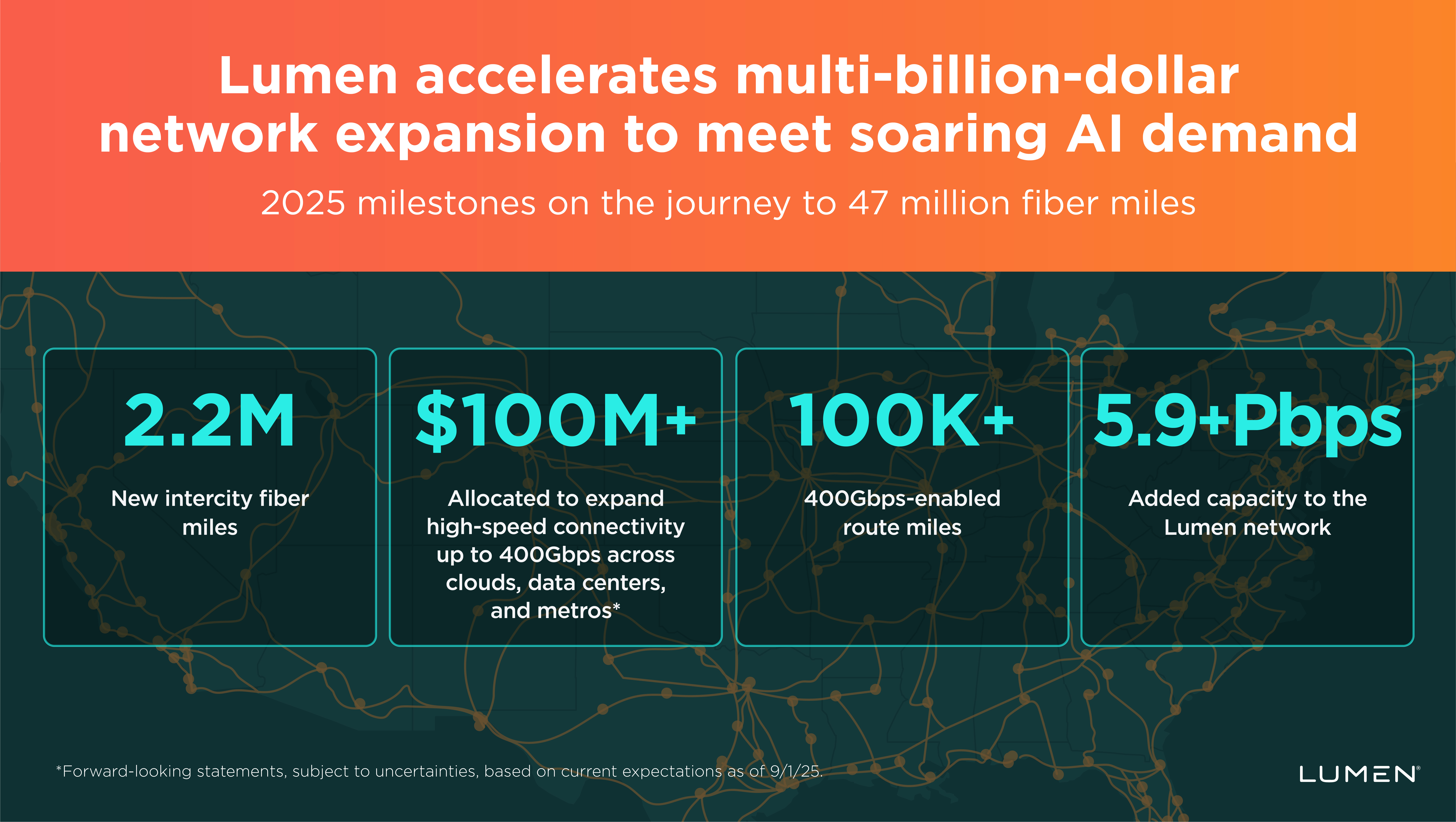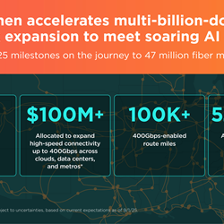 Extended Faster Speeds: Earmarked more than $100 million to bring high-speed connectivity up to 400Gbps across clouds, data centers, and metros, creating a more seamless, high-performance pipeline for AI workloads. The Lumen 400G-enabled network now spans more than 100,000 route miles.