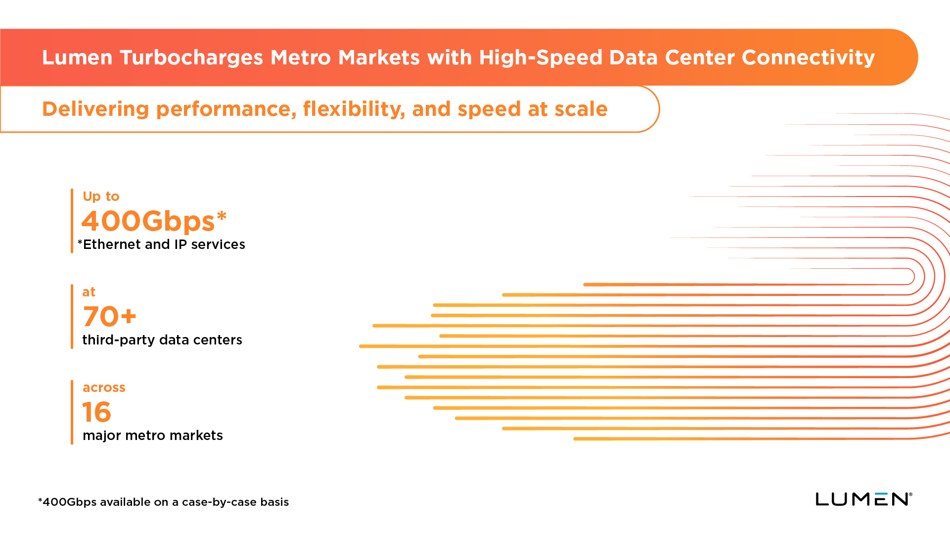 Lumen solutions available at these data centers support speeds up to 400Gbps–built to meet the demands of AI, cloud, and next-generation enterprise workloads. Customers can access: